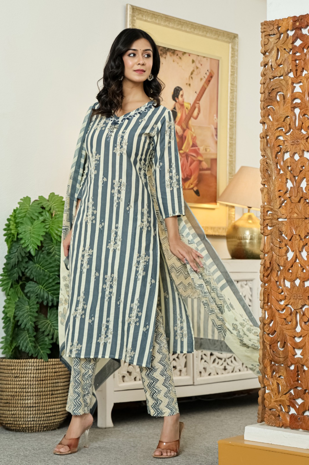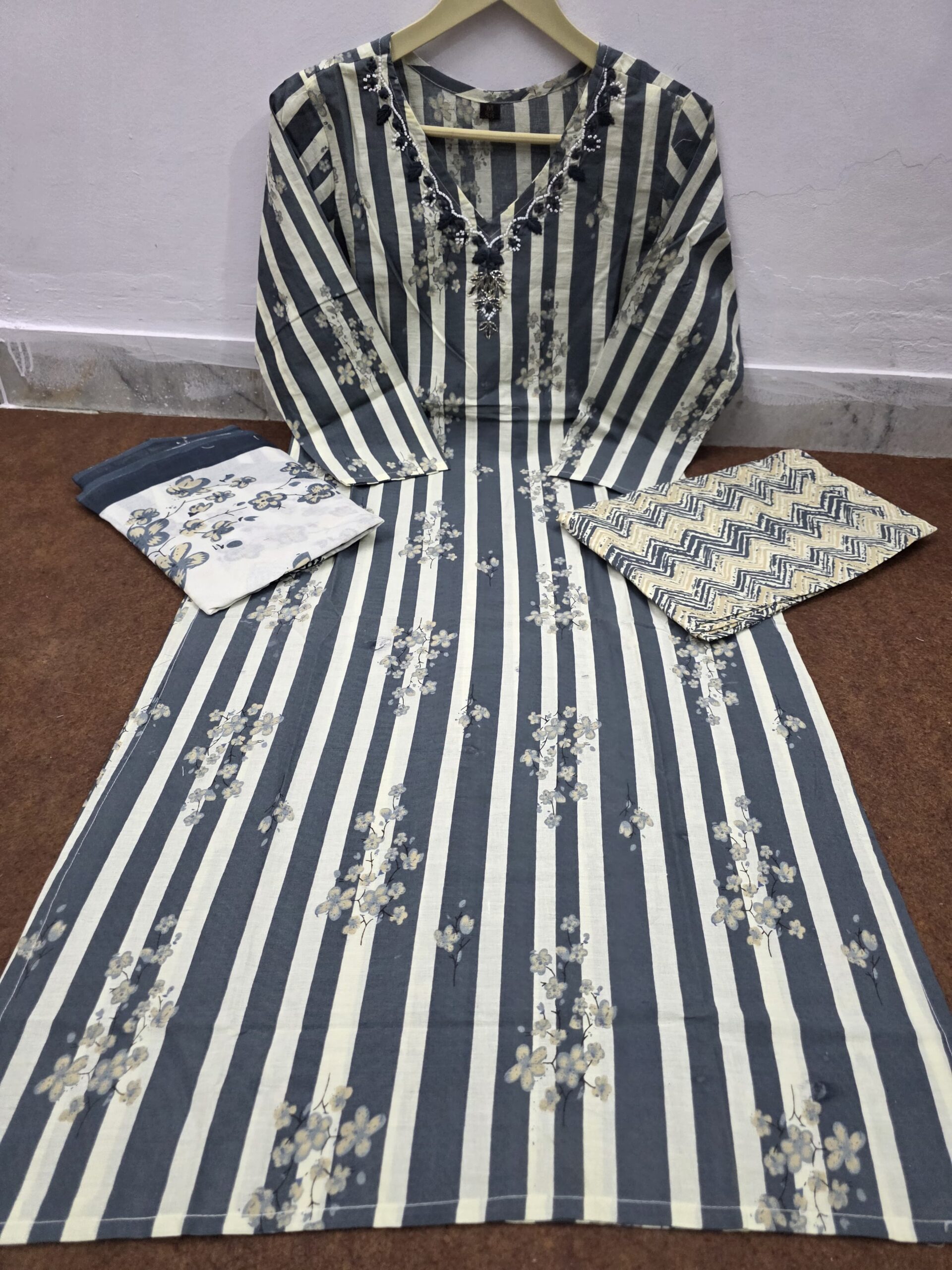 Step into elegance with this premium heavy cotton ethnic set featuring intricate embroidery and handwork. Includes kurti, pant, and 100×100 cotton dupatta.