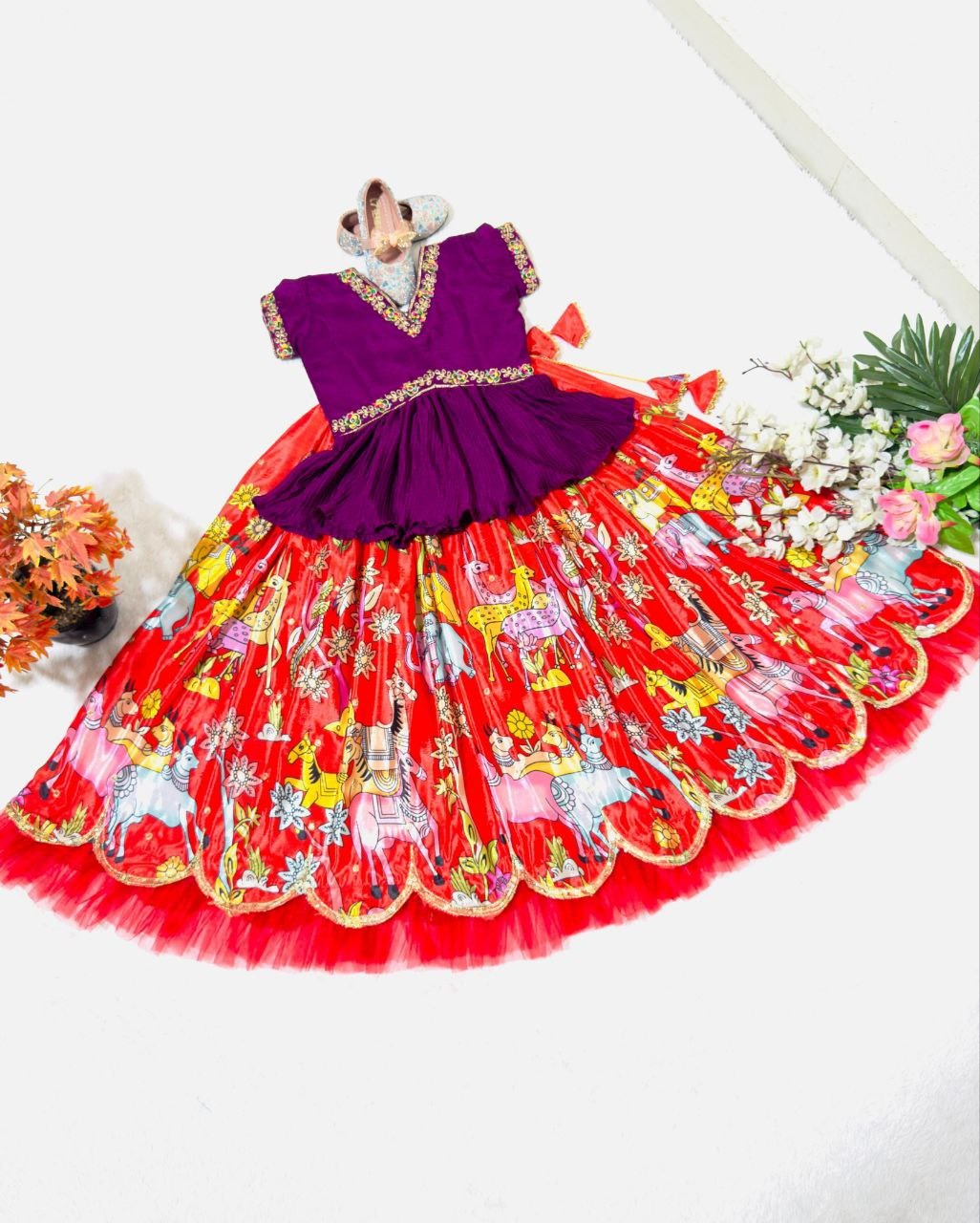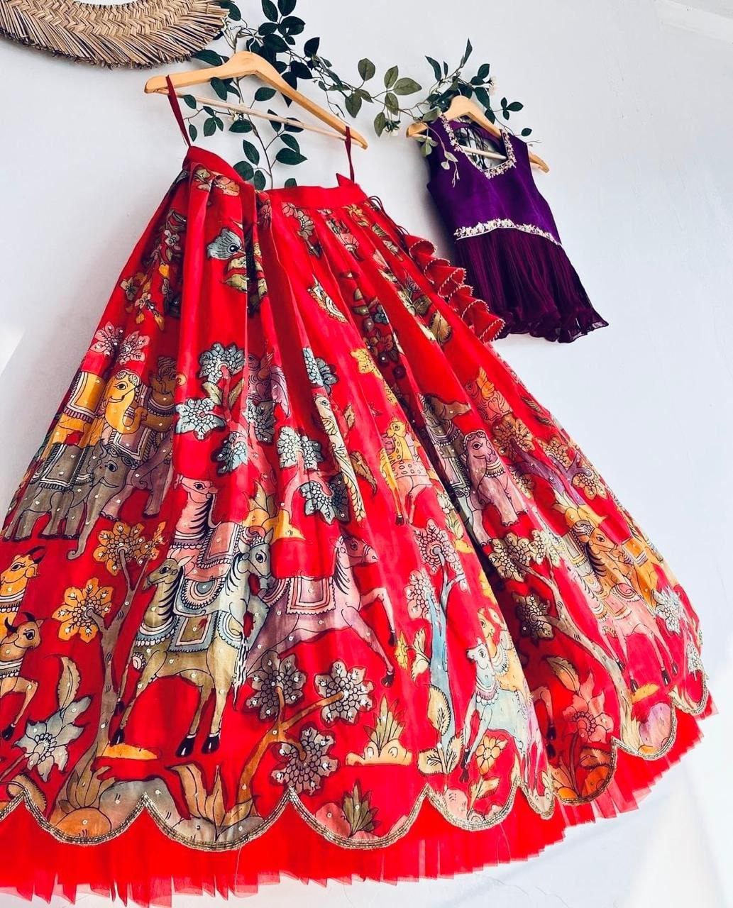 🔷 Trending Kalam Kari Printed & Embroidered-Work Stitched Lahenga-Blouse Season