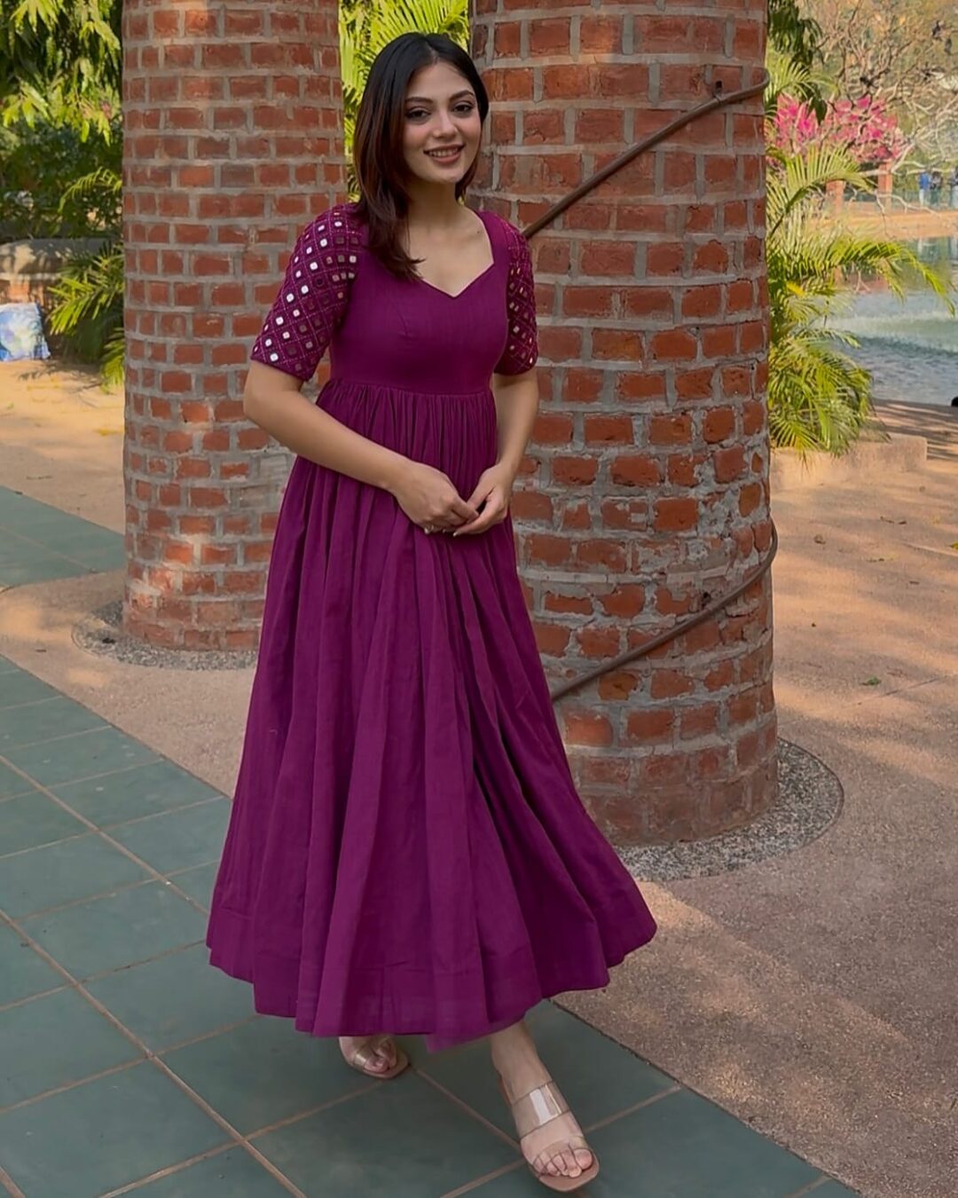 Step into elegance this festive season with our pure cotton Anarkali suit set featuring mirror and hand embroidery. Perfect for office and daily wear comfort with a classy touch.